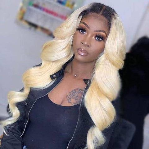 Deze perfecte combinatie van zwarte wortels en een lichtblonde tint creëert lang, zijdezacht, golvend haar met een elegante scheiding in het midden.