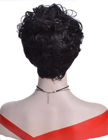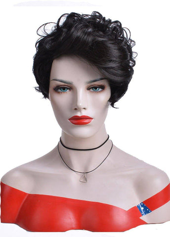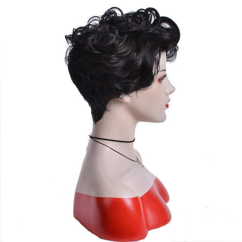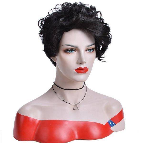 Maak je casual outfits stijlvoller en twijfel nooit meer om je haar te knippen met onze Kort Haar Pruik Zwart pixie en krullend. De diepste tint zwart, gestyled in een licht asymmetrische krullende pixie vergezeld van een zijscheiding, is ideaal om je volgende looks een wildere touch te geven.
