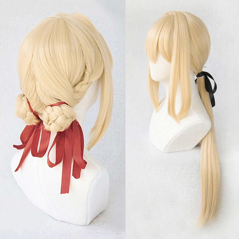 Ga aan de slag bij CH Postal en word een Auto Memory-pop met onze Violet Evergarden-pruik! De ideale zachtblonde tint gestyled in een lange lage paardenstaart of twee knotjes met kleine vlechtjes, vergezeld van een centrale franje en lint dat perfect op Violet lijkt.