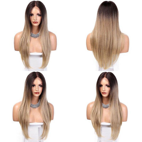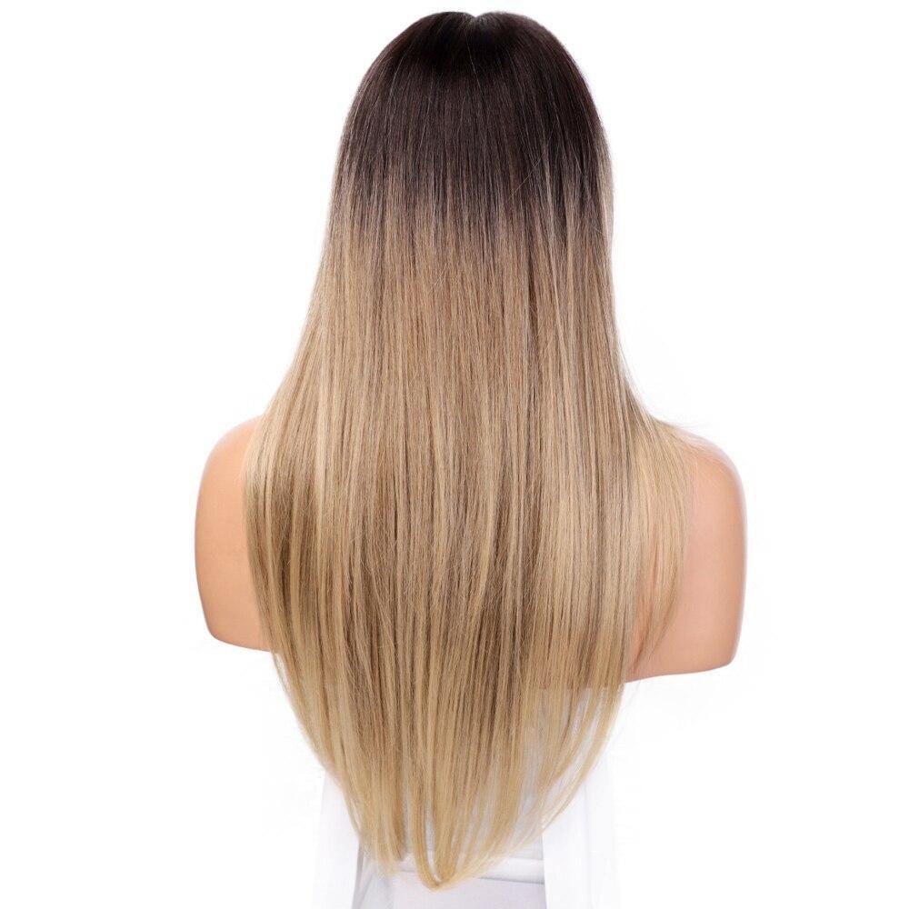 Zet nieuwe trends met elke stap die je zet met onze lange lace front pruik! De ideale combinatie van donkerbruine wortels en honingblonde punten, gestyled tot een lange, zijdezachte, rechte manen met een scheiding in het midden, vergezeld van een pruikennet dat een langdurige hold garandeert.