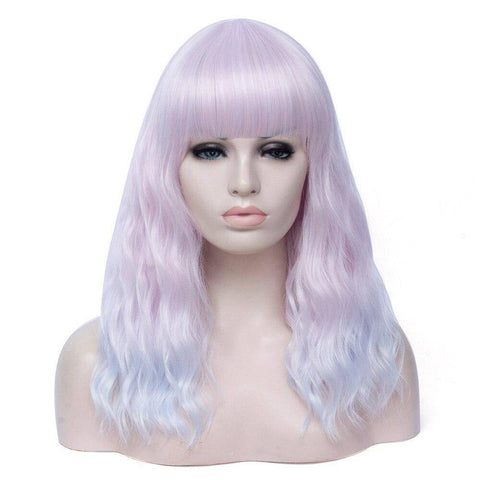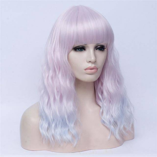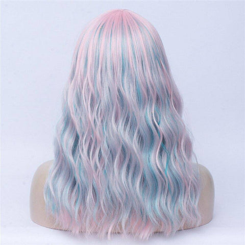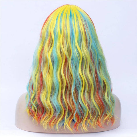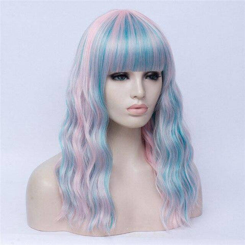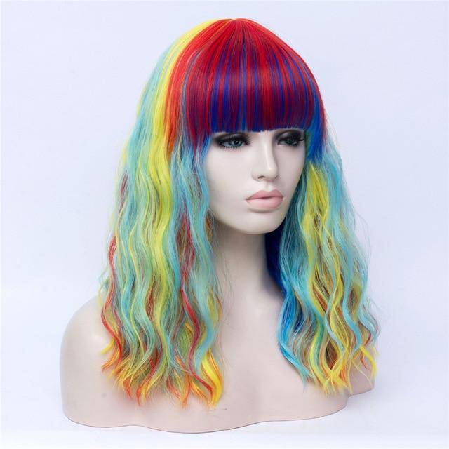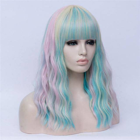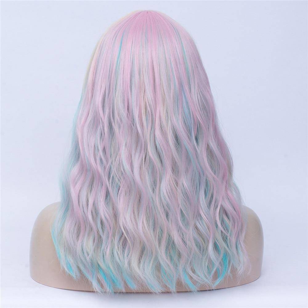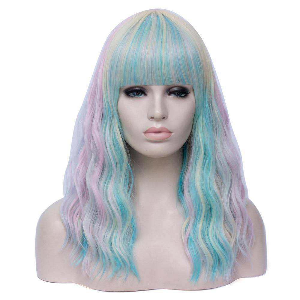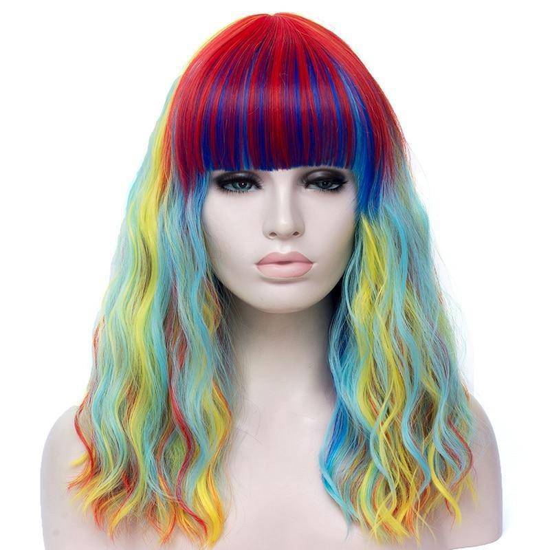 Laat de magische fantasie los op je volgende outfit en zie eruit als een eenhoorn rechtstreeks uit een sprookje met onze Multicoloured midi golvende Damespruik! Een ruime keuze aan regenboogcombinaties van rode wortels tot blauwachtige en groenachtige uiteinden, zacht pastelroze tot licht pastelblauw, pastelgroen tot lila highlights en blauwe basis tot lila highlights; gestyled met beach waves, ideaal om je elke dag als een pastelkleurige goth-prinses te voelen.