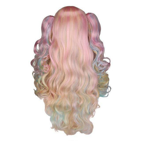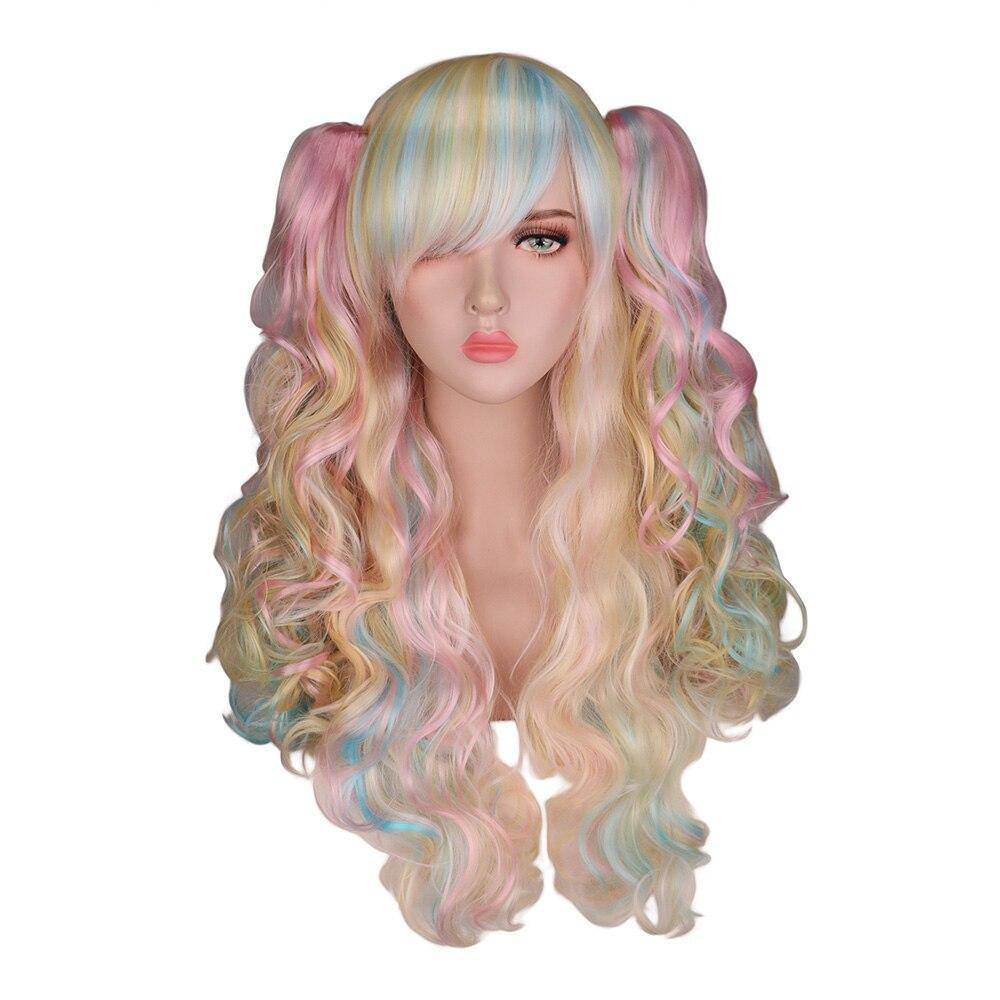 Verander jezelf in de waifu van je dromen en maak je kawaii outfit moeiteloos uniek met onze veelkleurige krullende paardenstaartpruik! De perfecte mix van roze, lila en geelachtige tinten om een pastelregenboog na te bootsen, vergezeld van franjes aan de zijkant en gestyled in twee halfhoge paardenstaarten die ideaal zijn om bij elke cosplay in je garderobe te passen.