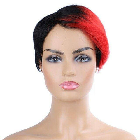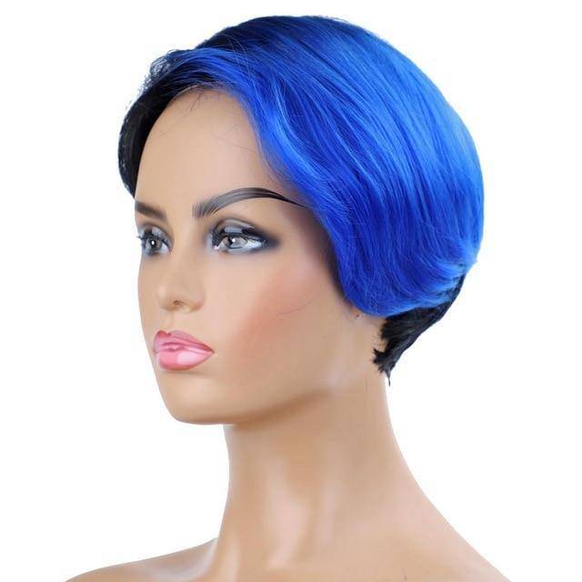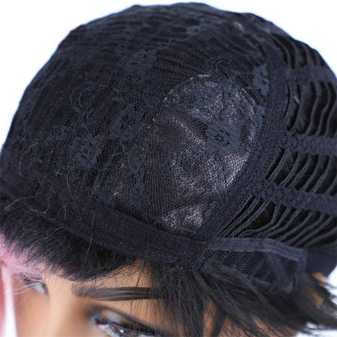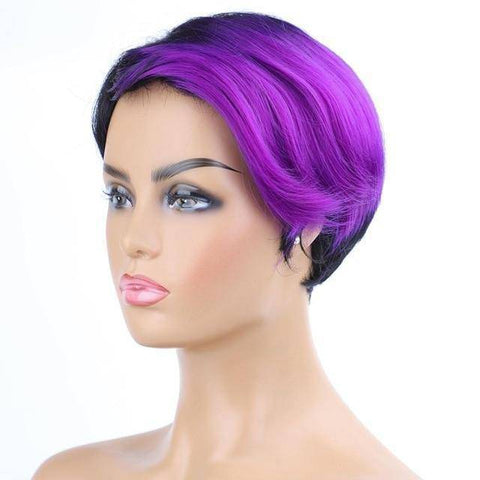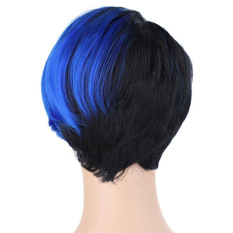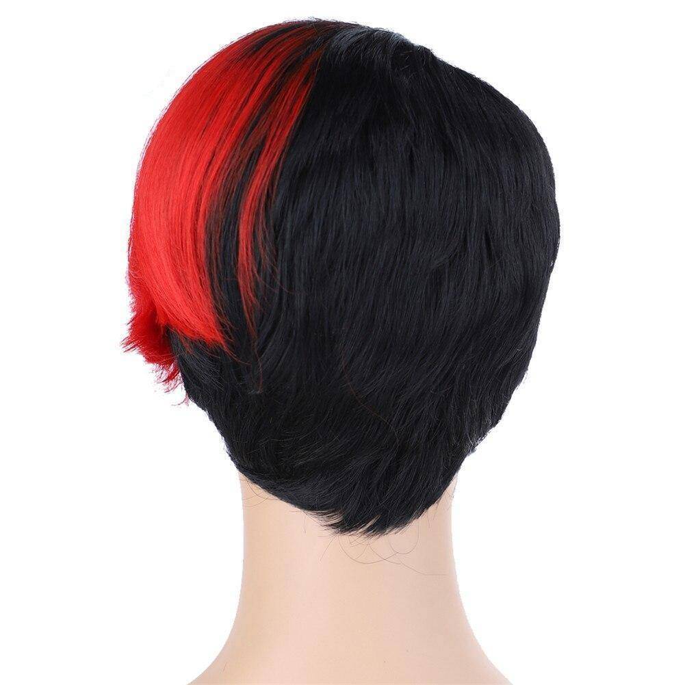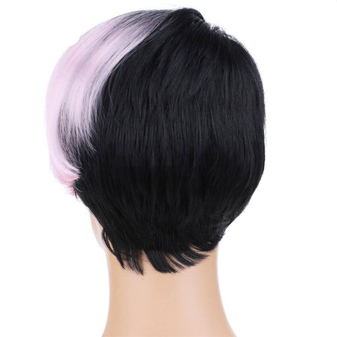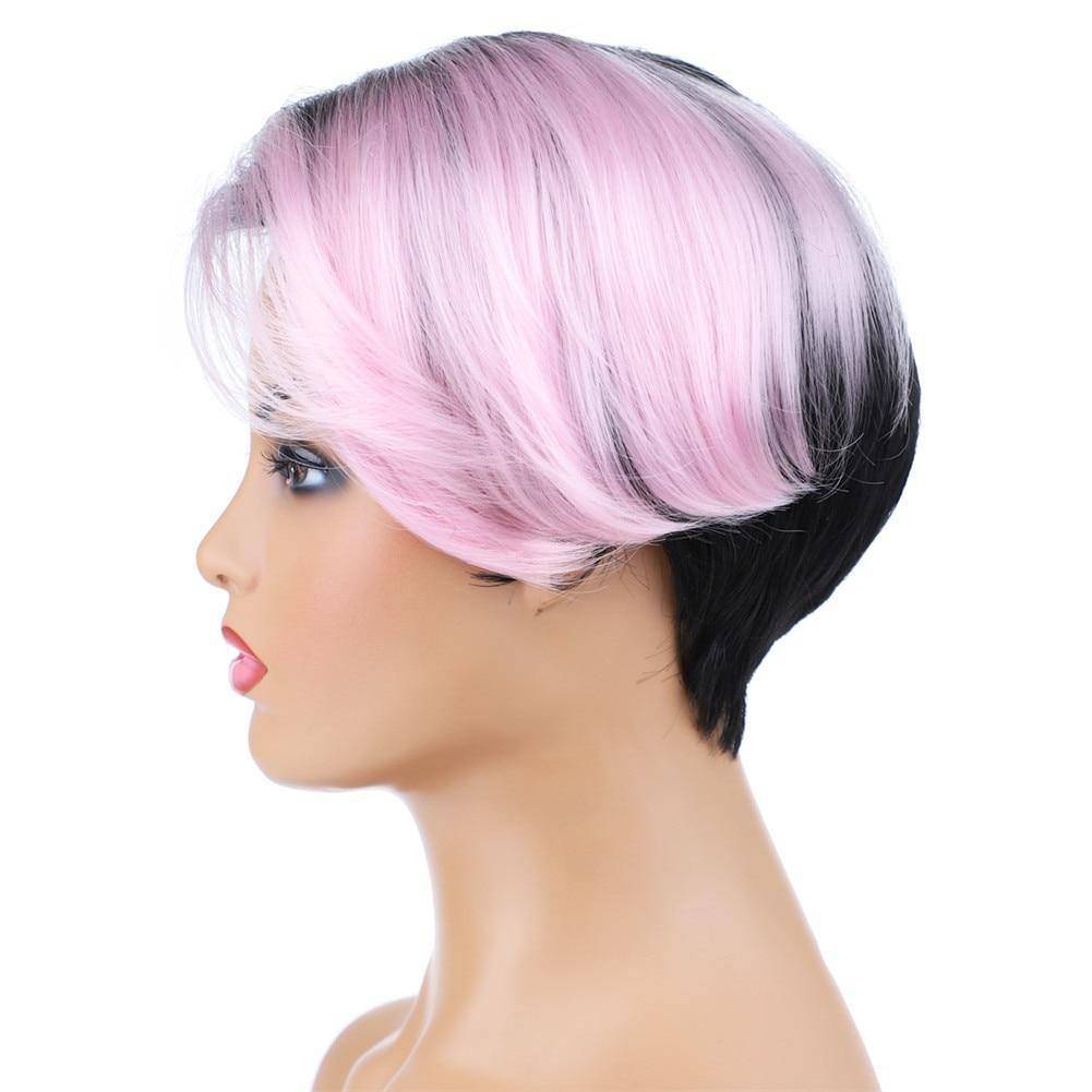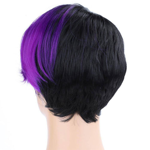 Geef je volgende look in een paar seconden een kleurrijk accent met onze zeer korte damespixiepruik! De perfecte mix van een diepzwarte basis en vier verschillende beschikbare topkleuren: pastelroze, levendig rood, helder paars en metallic blauw, gestyled tot een pixie met een grof accent aan de zijkant, ideaal voor een minder serieuze look.